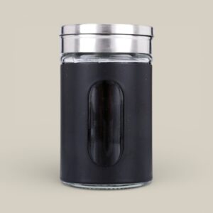 Especiero redondo de vidrio cubierto de metal negro c/visor y tapa acero 5*8cm